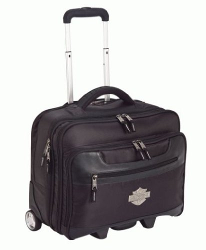 Great for business or airline travel. Fully organized with three sections and numerous pockets. Padded laptop section, file folder sections, and organizers. Can be carried on board major airlines. Front easy-open organized section and hidden telescoping pull handle for easy transport. Piggy-back web on back allows you to carry on top of accompanying luggage pieces. Interior has Harley-Davidson® signature map printed lining. Measures 16.5'' x 13'' x 9'' (1930.5 cu.in)